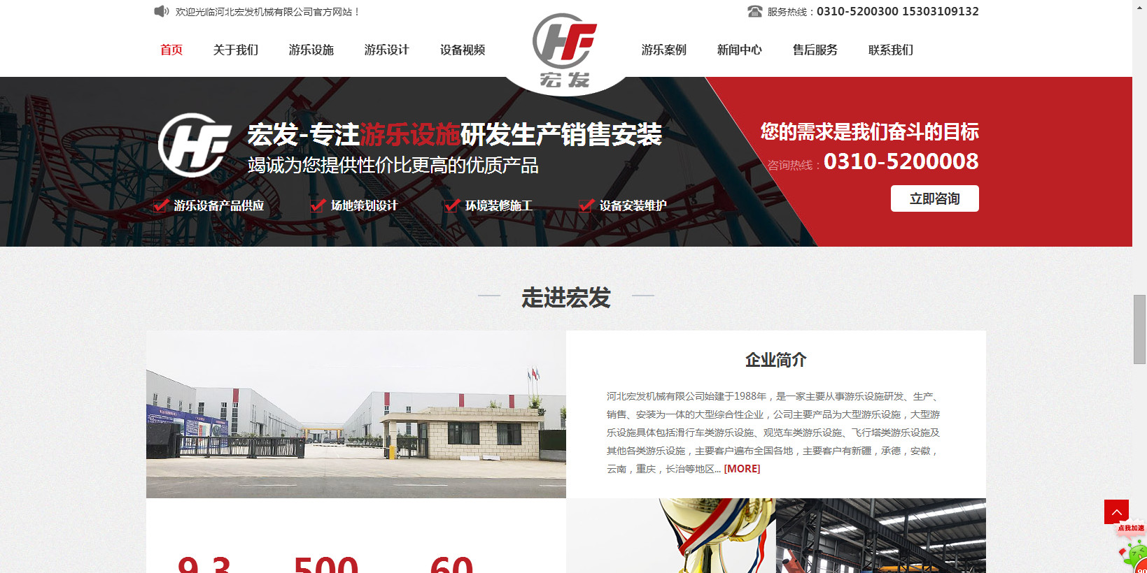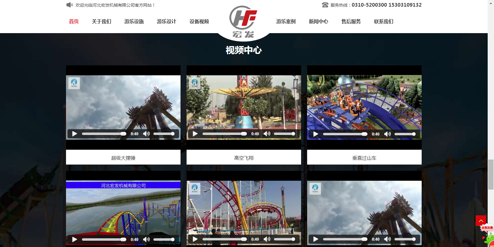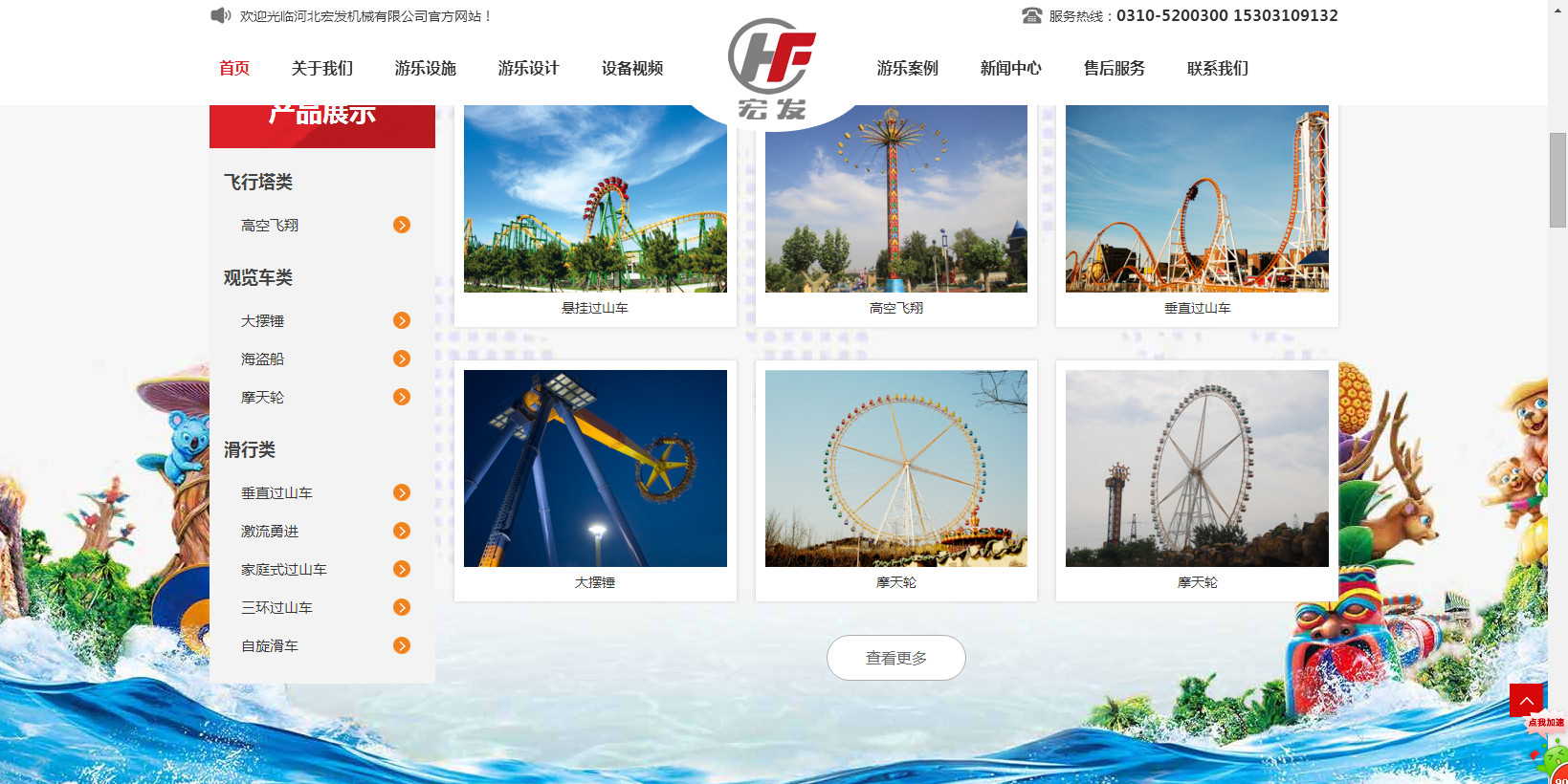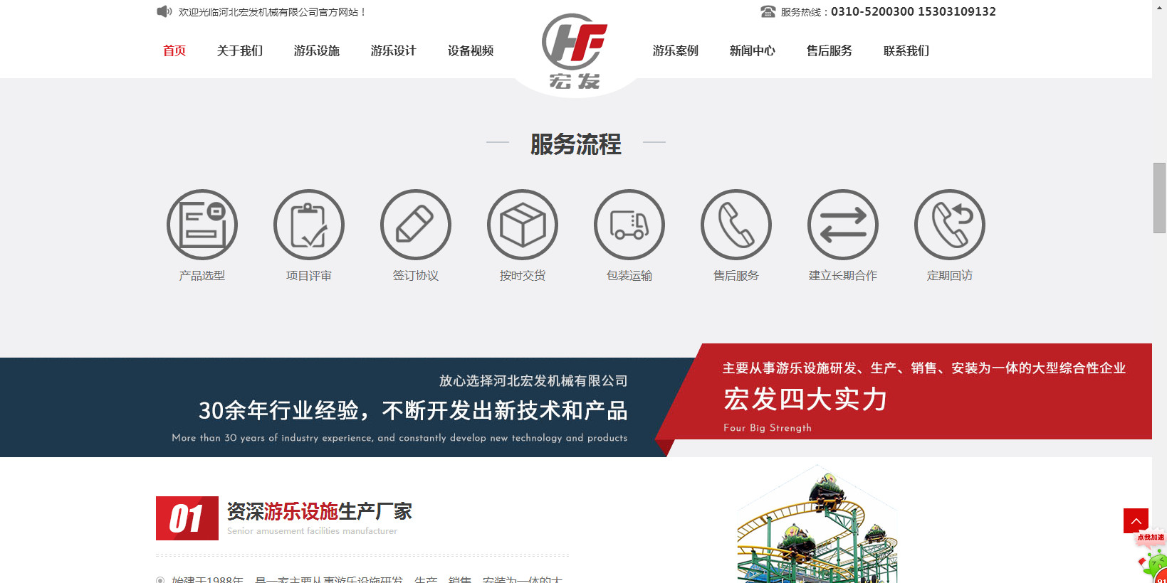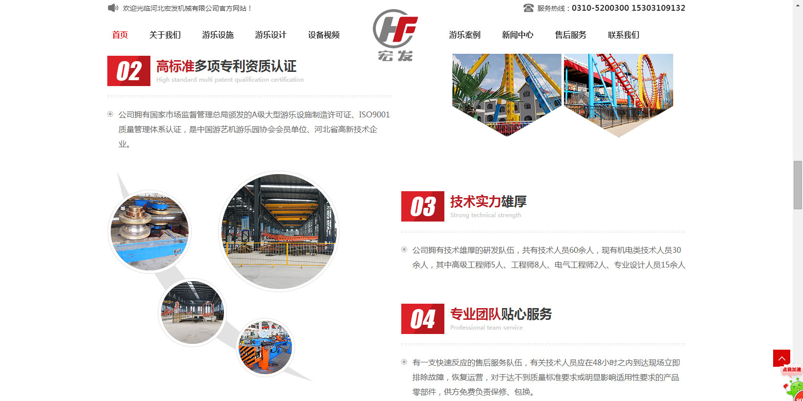 公司生產的“宏發”牌系列過山車,觀覽車(摩天輪),空中飛翔及深受游客喜歡的豪華轉馬、章魚、阿拉伯飛系列的中型游樂設備,為擴大游樂設備的開發與生產于2014年初與北京長城聯名思力科技有限公司強強聯合,形成集研制、設計、開發生產的戰略伙伴。