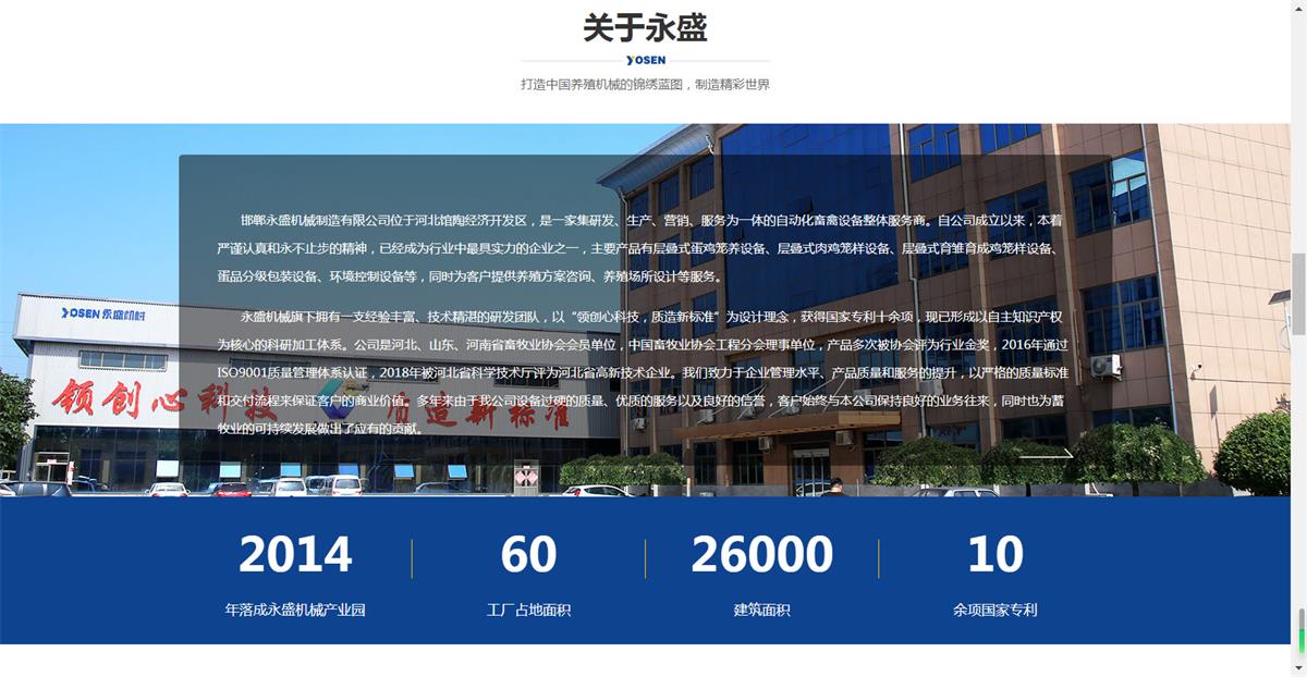 館陶縣永盛機械制造有限公司成立于1991年,前身館陶永興機械廠,坐落在“中國蛋雞之鄉”河北館陶,是一家集科研、設計、制造、銷售于一體的***生產畜牧機械、飼料機械、養殖成套設備的企業。公司位于309與106國道的交匯處,北臨青蘭高速,西臨大廣高速,南臨邯濟鐵路,交通便利...